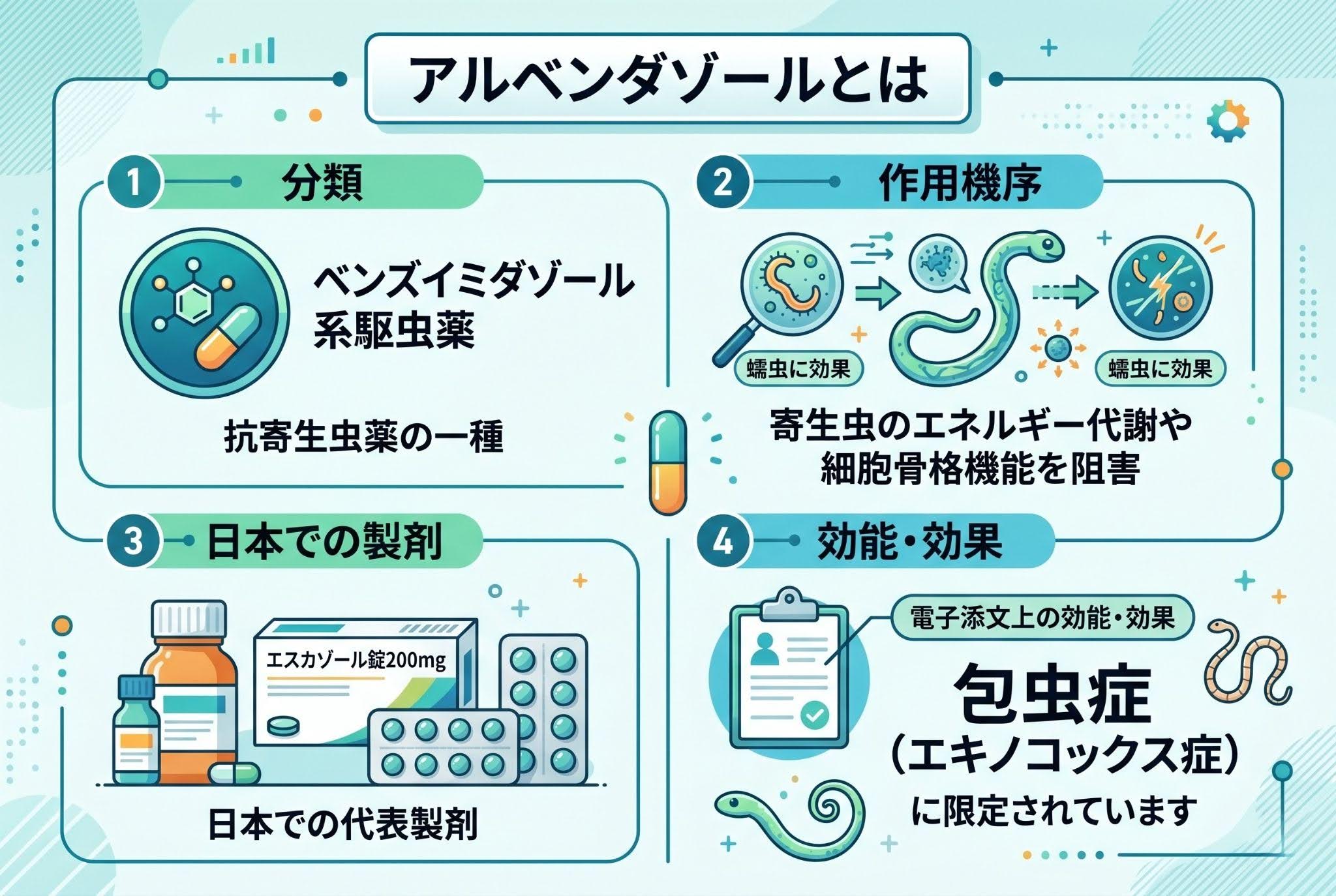 アルベンダゾールは、寄生虫感染症の治療に使われる駆虫薬です。ベンズイミダゾール系に分類され、寄生虫の代謝や細胞機能を阻害することで作用します。日本では、主に包虫症に対して使用される成分として承認されています。
