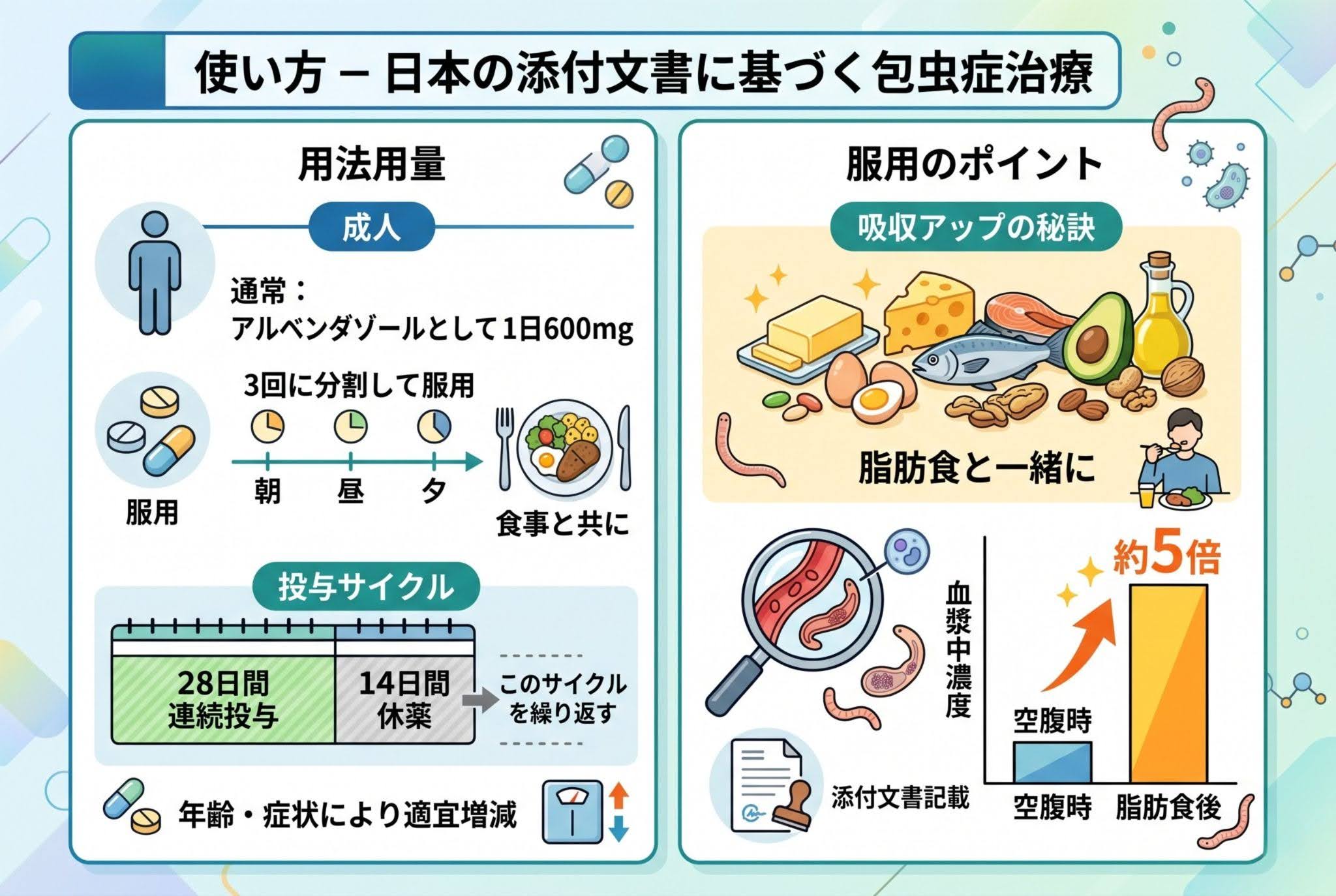 日本では包虫症に対して承認されており、食事とともに服用し、投与と休薬を組み合わせたサイクルで使用されます。