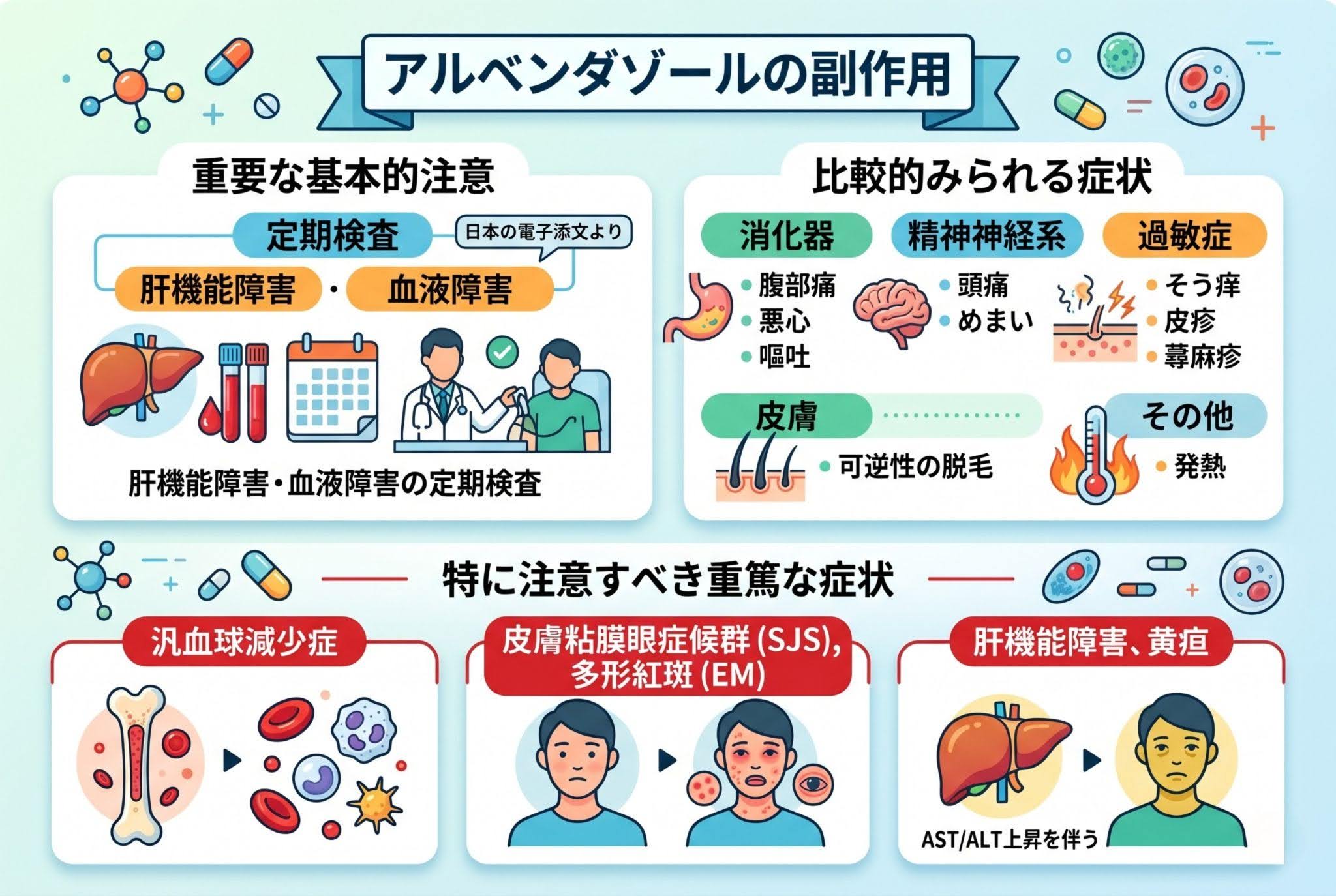 アルベンダゾールを使用するにあたり、効果だけでなく、副作用や注意点、適応範囲もあわせて確認することが大切です。
