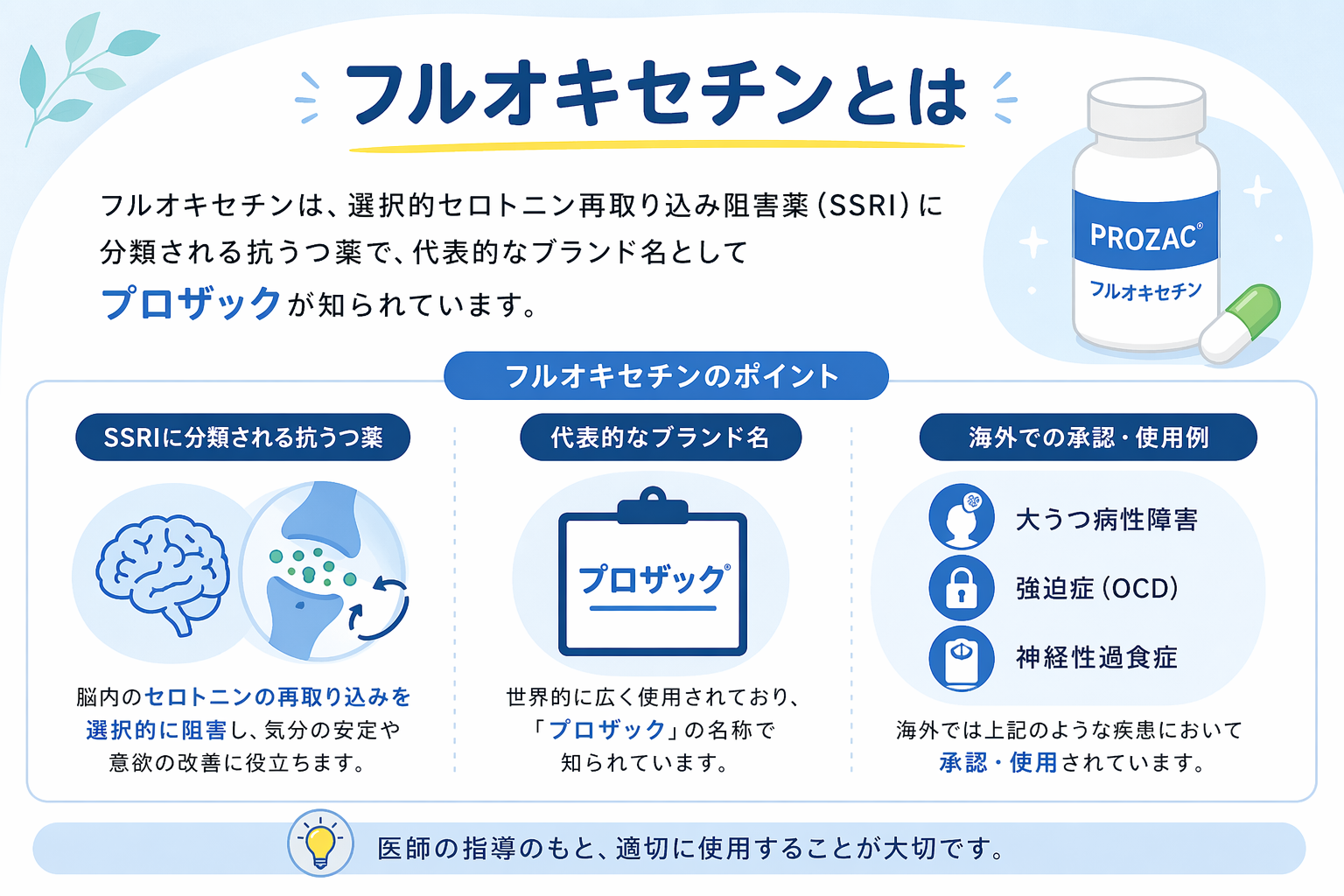 海外では抗うつ薬として使用されており、代表的な医薬品名としてプロザックが知られています。主に海外では、大うつ病性障害、強迫症、神経性過食症、パニック症などに対して使用されています。