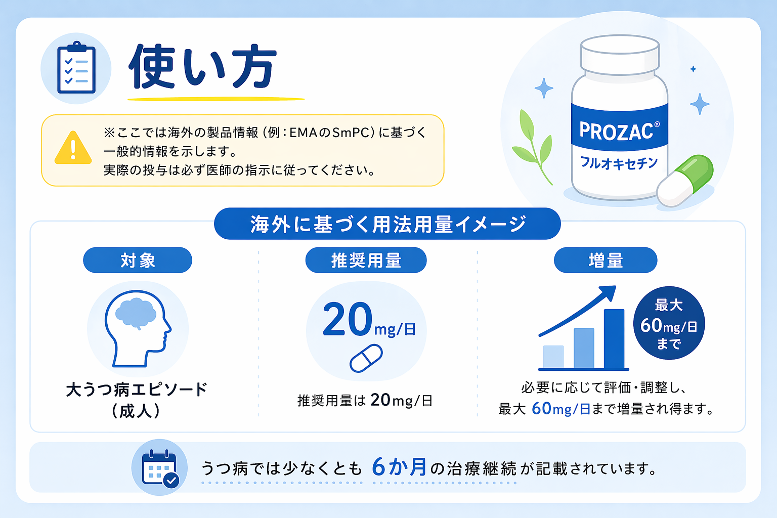 大うつ病の場合、成人の推奨用量は20mg/日とされます。必要に応じて評価・調整し、最大60mgまで増量されます(欧州SmPCの例)。うつ病では少なくとも6か月の治療継続が記載されています。