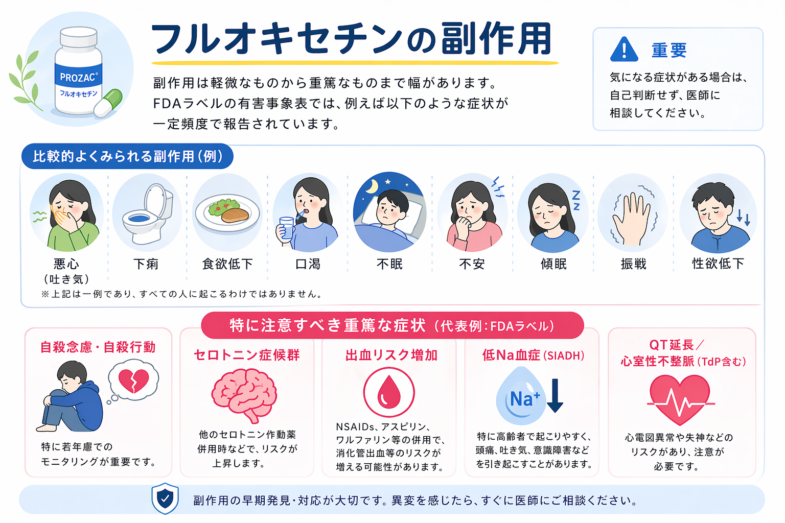 フルオキセチンでは、吐き気、下痢、食欲低下、口渇、不眠、不安、眠気、頭痛、めまい、振戦、性欲低下などが報告されています。