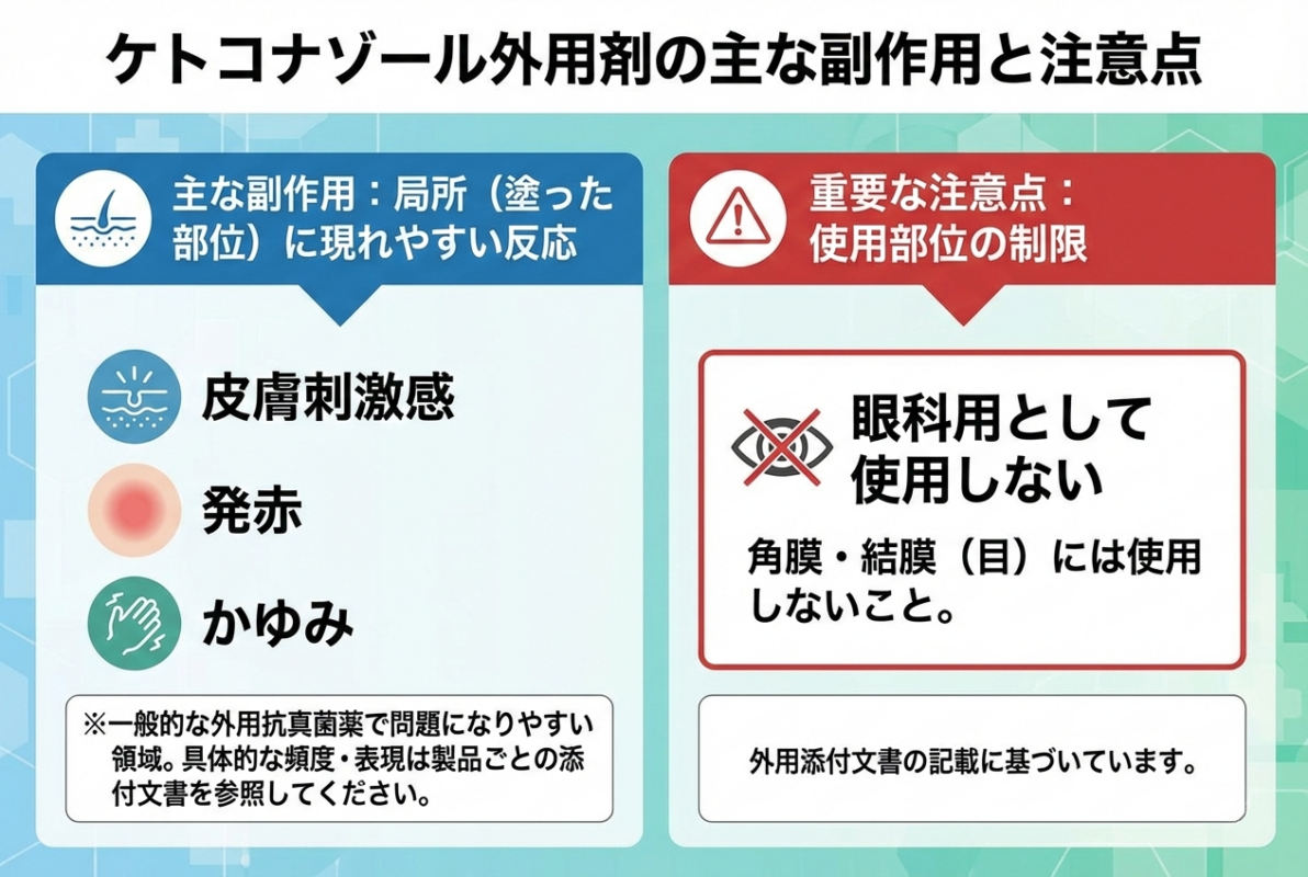 外用ケトコナゾールでは全身性副作用よりも局所反応が中心となります。