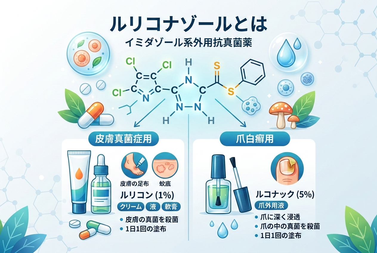 ルリコナゾールは、皮膚や爪に感染する真菌(カビ)に対して作用するアゾール系の外用抗真菌成分です。