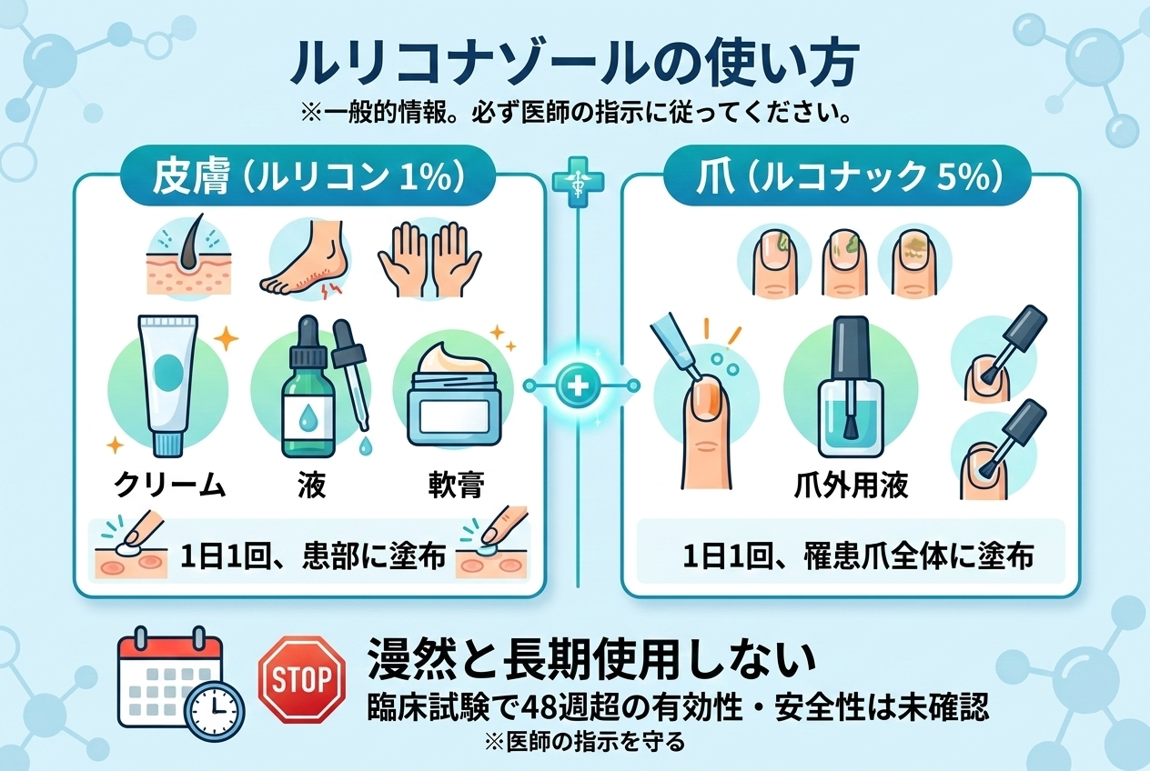 爪外用液の場合には、患部の爪全体に塗布し、周囲の皮膚に付着した薬剤は拭き取ることが推奨されています。