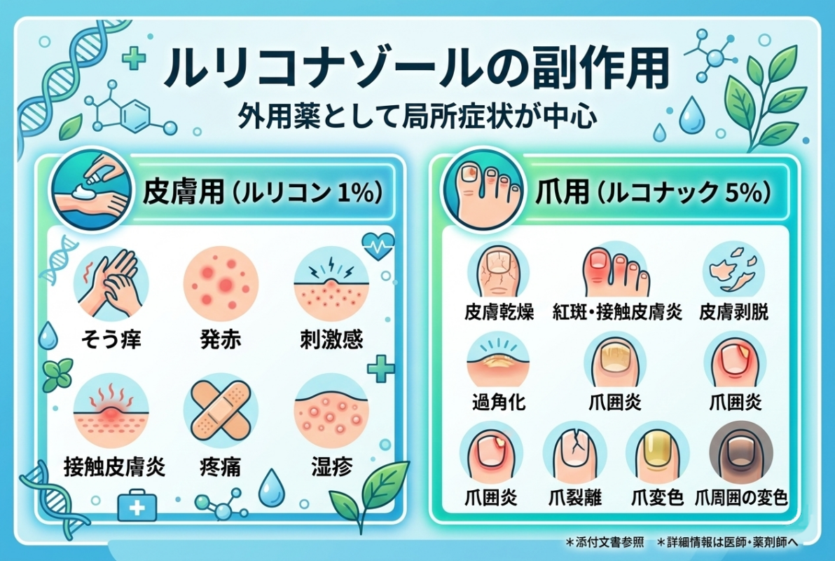 ルリコナゾールは外用薬であるため、副作用は主に塗布部位に生じる局所症状です。