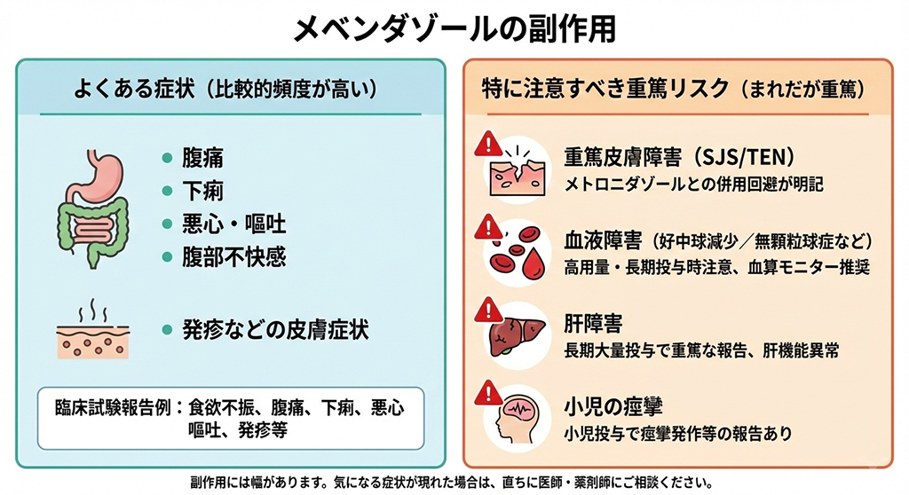 メベンダゾールでは、腹痛や下痢、吐き気、発疹などの比較的軽度な副作用が報告されています。