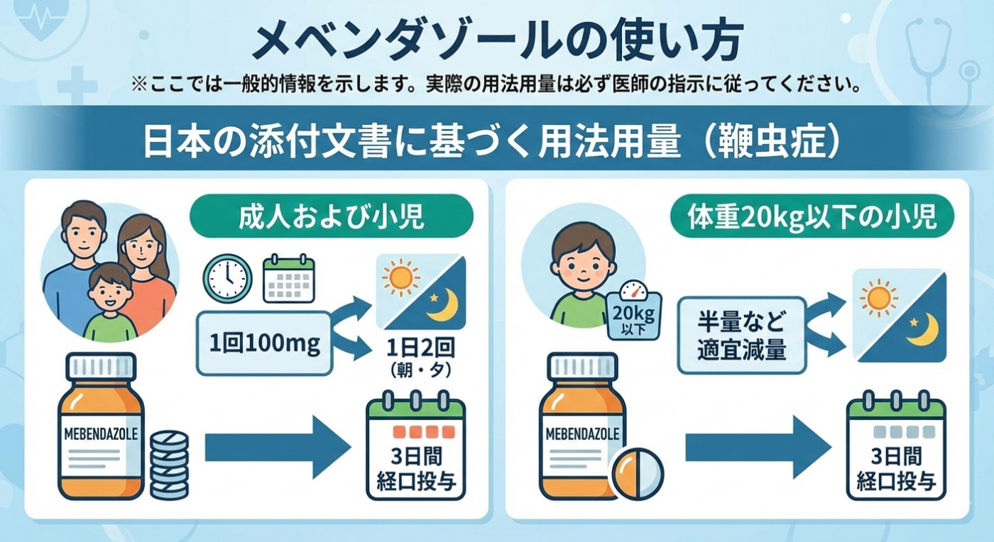 鞭虫/回虫/鉤虫:100mg(1錠)を朝夕、3日間(※同一成分でも国により承認用法用量が異なり得ます。)