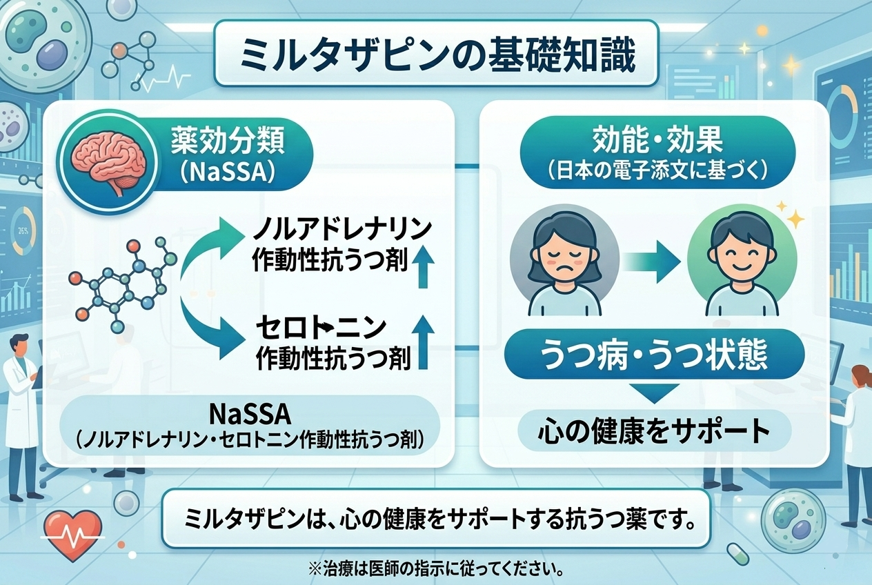 ミルタザピンは、ノルアドレナリン・セロトニン作動性抗うつ薬に分類される医薬品です。日本では、うつ病・うつ状態に対して使用されます。