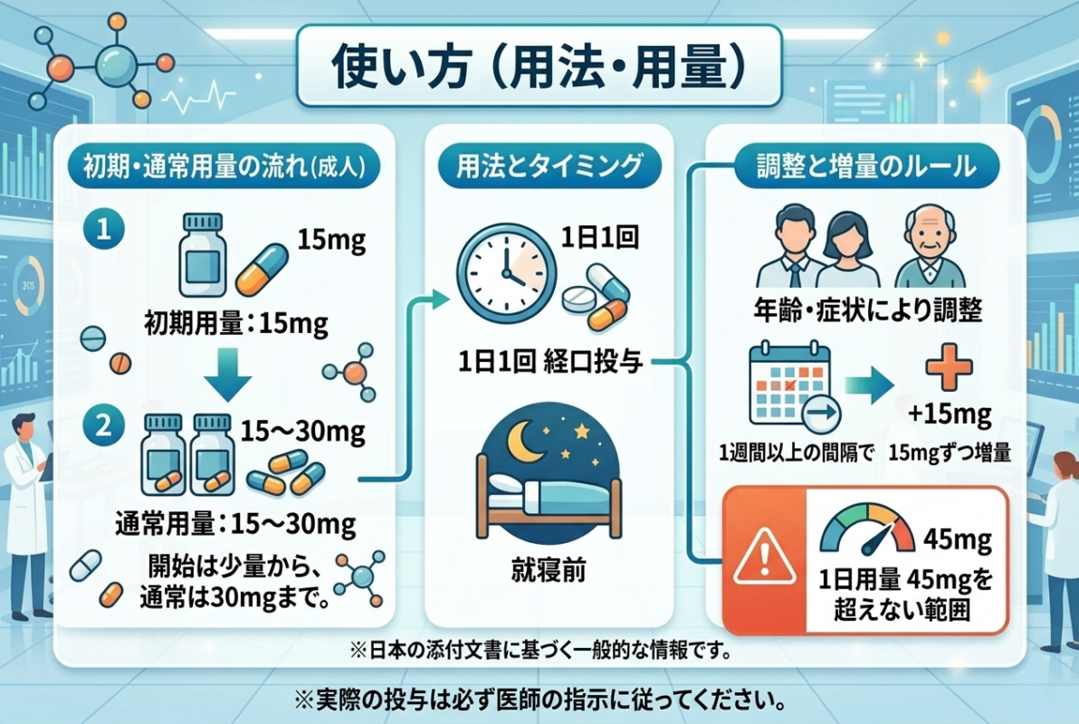 この薬は、不眠や食欲低下を伴うケースで検討されることがあります。眠気が出やすく、食欲が改善しやすいためです。一方で、日中の眠気や体重増加が負担になることもあります。そのため、症状だけでなく生活への影響も踏まえて使用が判断されます。