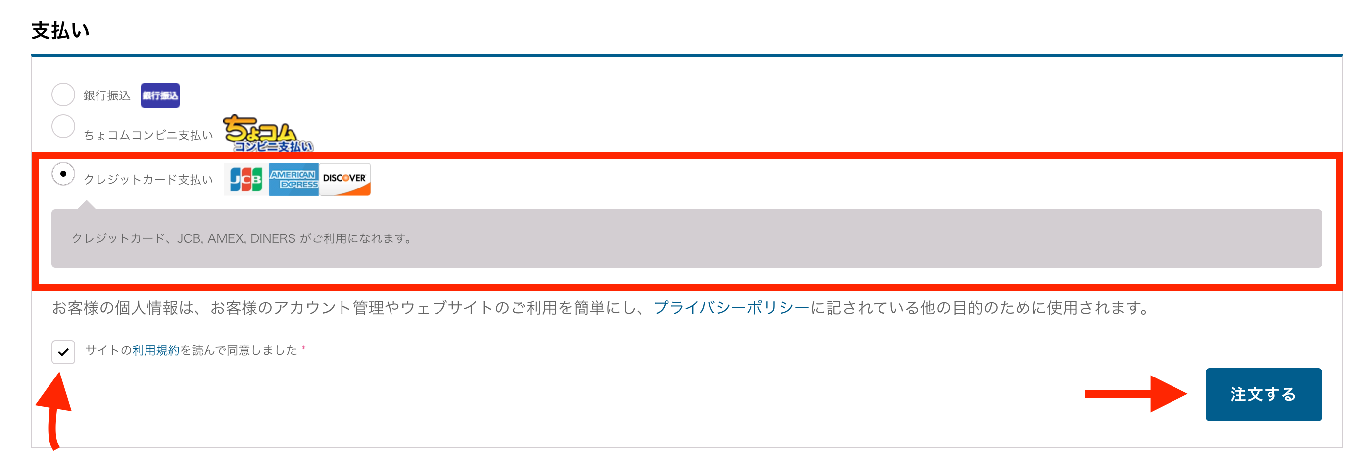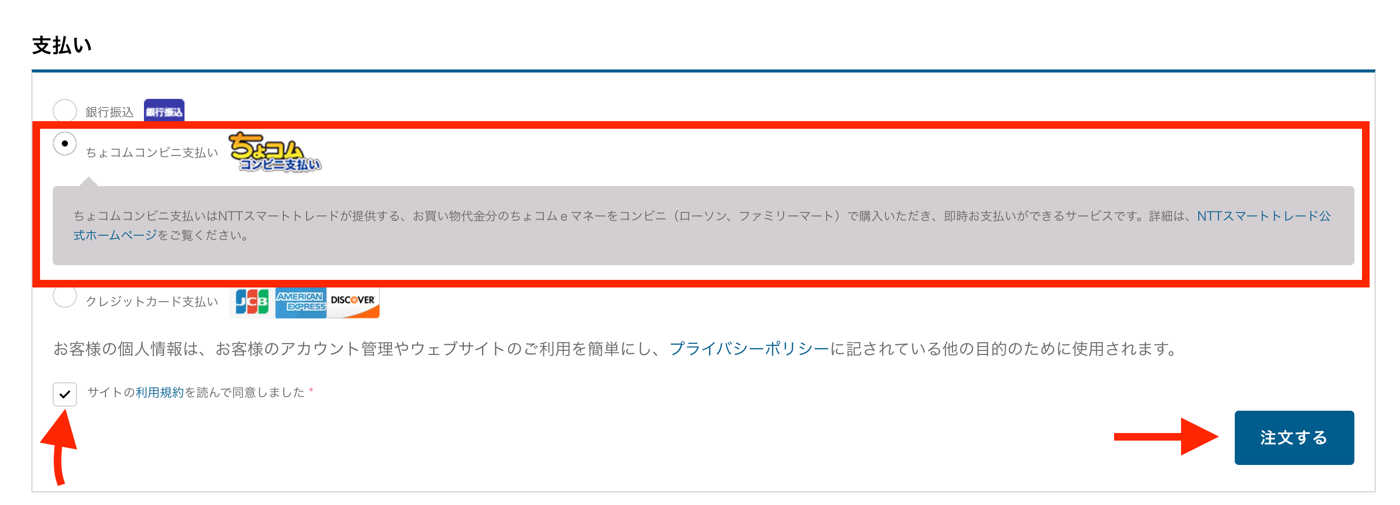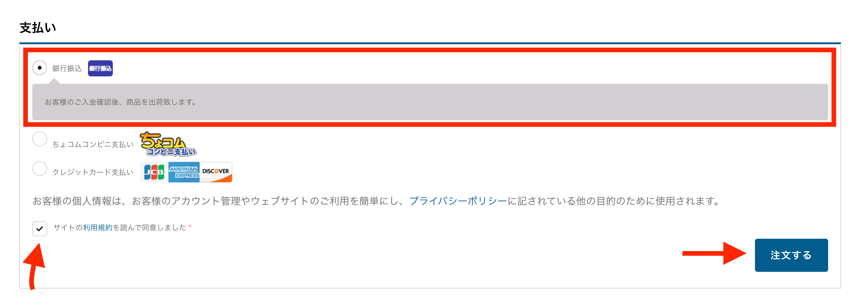 1. 銀行振込を選び、「サイトの利用規約を読んで同意しました」にチェックを入れて、「注文する」をクリックします。
