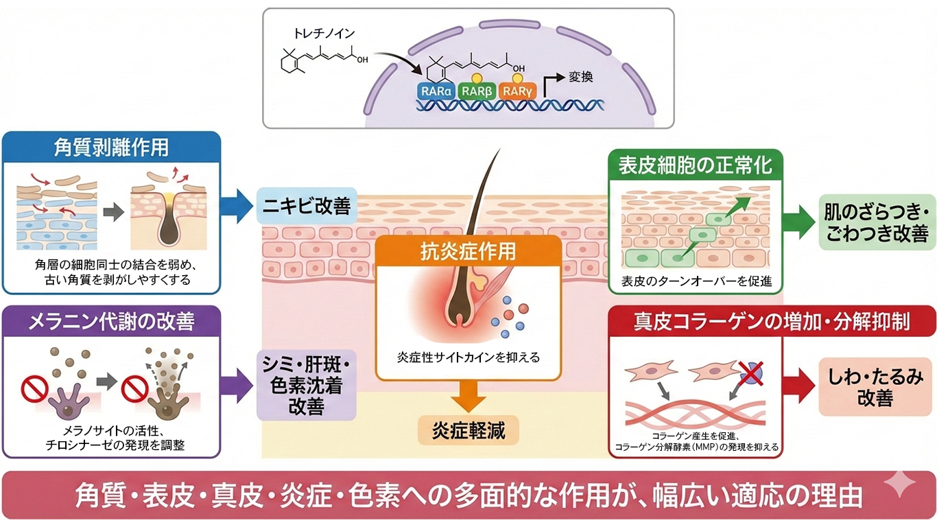 この「角質・表皮・真皮・炎症・色素」への多面的な作用が、トレチノインが多くの皮膚疾患と美容目的で使われる理由です。